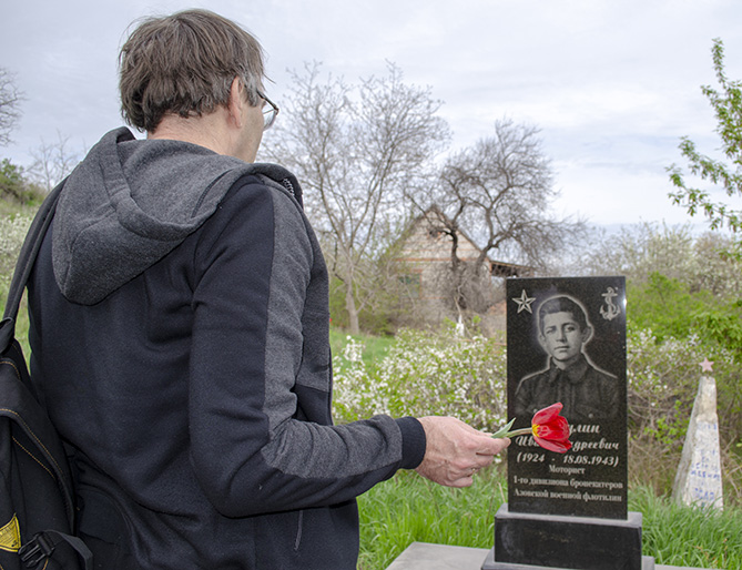 «Уночі з 17 на 18 серпня 1943 року деякі жителі рибальських селищ Лівого берега Маріуполя чули залпи й бачили вогні морського бою поблизу міста. Вранці море прибило до берега мертвого солдата, одягненого в морській бушлат, - розповідає Валентина Зінов'єва. - Мешканець Найдьонівки Омелян Грицай домігся дозволу поховати бійця у будинку, де мешкав німецький офіцер, один із командирів зенітних батарей, встановлених неподалік. Омелян разом із молодшим 15-річним сином Павлом погрузив тіло бійця на тачку, привіз на селищне кладовище і разом з іншими місцевими жителями заховав. Саме Павло й розповів мені ці подробиці.