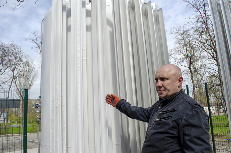 Світлина Людмили Єрмішиної. Замінює кілька постів з балонами. «Спосіб подачі кисню за допомогою вакуумного газифікатора - найбільш передовий та надійний», - каже Євген Рябов, співробітник кисневого цеху меткомбінату «Азовсталь».