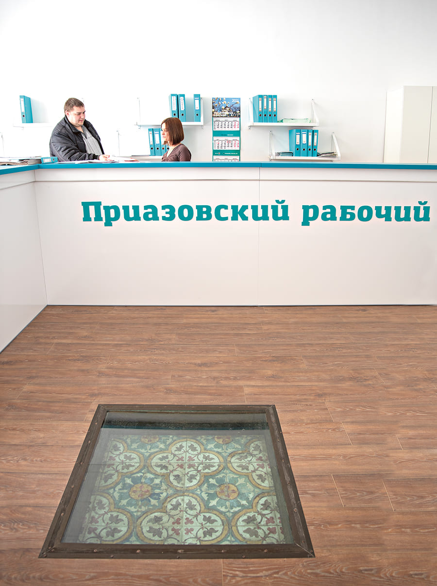 «Ми вирішили таким чином зберегти шматочок історії старовинної будівлі, - пояснює директор - головний редактор газети Олена Калайтан. - Підказав нам цей крок досвід подорожей по країнах, де дуже дбайливо ставляться до старовини. Коли я була в Італії, бачила, як у сучасних ремонтах там намагаються залишити недоторканою частину кладки, сходи, стіни, у рамочці, під склом. Ось і ми так зробили. Шкода, що виявилося неможливим зберегти всю плитку».