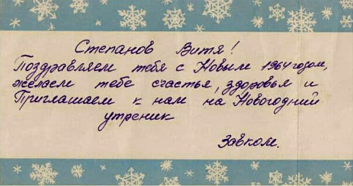 «Степанов Вітя! - писали чорнилами моєму маленькому батькові в запрошенні. - Вітаємо тебе з Новим, 1964 роком, бажаємо тобі щастя, здоров'я і запрошуємо до нас на новорічний ранок. Завком».