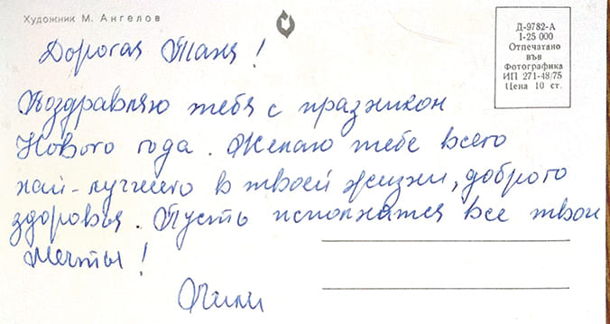 Наступну новорічну історію надіслала наша читачка Тетяна Чебанова: «З шостого класу я листувалася з Лілією Івановою Ілієвою з Народної Республіки Болгарія, яка жила в селі Беглеж поруч з містом Плевен. Напередодні Нового, 1975 року, навчаючись в місті Одесі, я отримала вітальну листівку від Лілії. Прості побажання, але від чистого серця і всієї душі принесли мені стільки тепла і радості! У сімнадцять років все життя попереду! Надії і мрії тільки про прекрасне майбутнє! А Новий рік - це свято добра, свято мрії і удачі! Цю листівку з побажаннями я зберігаю досі. Мрія подорожувати і побачити світ здійснилася вже в травні 1975 року. Закінчилось навчання, і ось мій перший рейс на турбоході «Максим Горький», а 31 грудня 1975 року, напередодні 1976-го, я зустрічала в місті Аден Республіки Південний Ємен. Ялинка у нас, до речі, була справжня: її взяли з собою з Союзу і тримали до свята в холодильній камері».