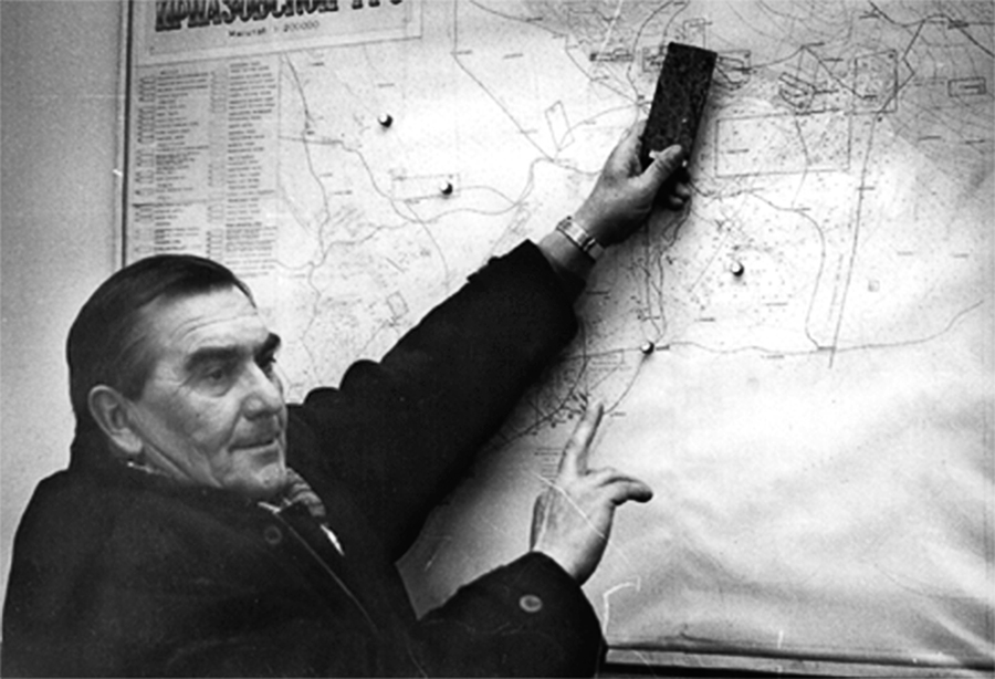 На світлині: Географія «скарбів». Начальник геологорозвідувальної експедиції Олексій Малий біля мапи корисних копалин Приазов'я.
