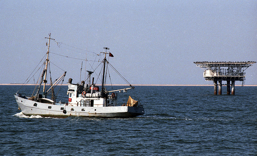 На світлині: Те, що потрібно, - на дні. Риболовецький сейнер на тлі газової морської платформи, яка видобуває газ на дні Азовського моря.