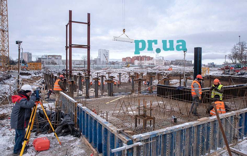 У величезному котловані головного корпусу вже можна бачити пальові основи фундаменту, закріплені ростверком, який розподілятиме навантаження від несучих конструкцій на опори. Над основою височить одна з частин металевого каркасу – для несучих конструкцій використовується метал підвищеної міцності, виготовлений на підприємствах Групи Метінвест.