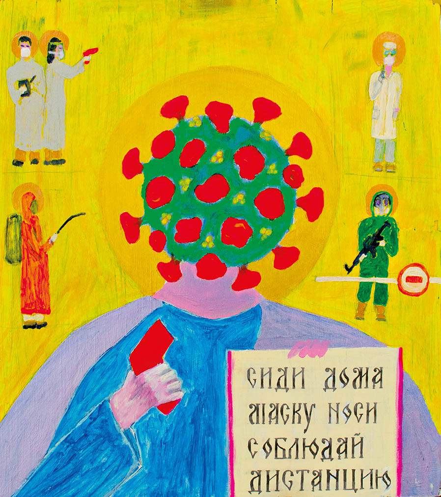 Чоловічий погляд на тему пандемії виявився не настільки серйозний. Олександр Малаховський «надів» на оголену натурницю захисну маску, а Дмитро К. (автор вважав за краще залишитися невідомим) представив «ікону» «Святий Ковідій».