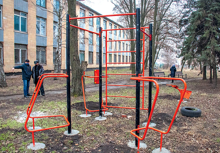 На фото Кирила Жульова: Вільну хвилинку - тренуванню. Двір електромеханічного технікуму прикрасив новенький спортивний комплекс.
