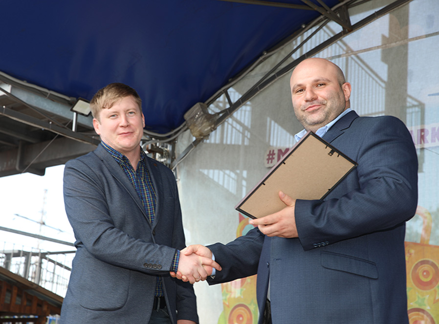 Світлина Миколи Коляди: Заслужена перемога. Начальник управління з питань екології, енергоменеджменту та охорони праці Ваагн Мнацаканян вручив нагороду іллічівцю Євгену Белослудцеву.
