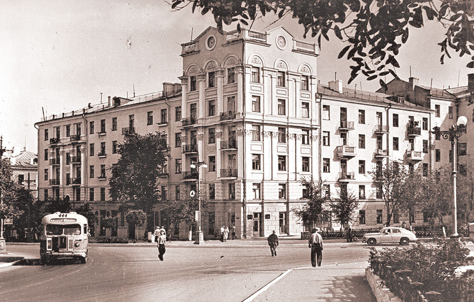 Гідне обрамлення центру. Цей будинок - одна зі «сталінок», оточуючих Театральний сквер, які створюють цілісний архітектурний ансамбль.