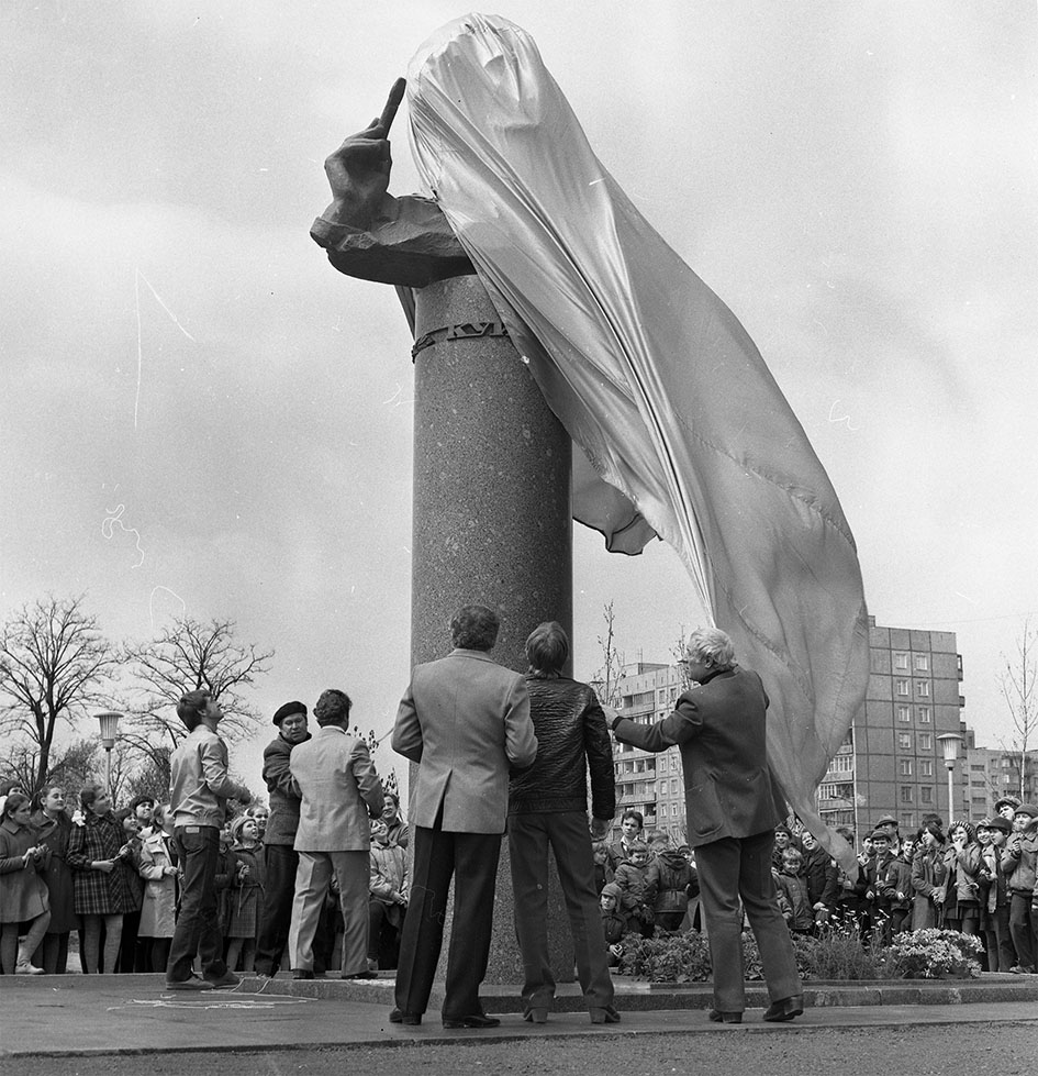 Світлина Бориса Дембицького: Грандіозна подія. У квітні 1984-го на урочистому відкритті пам'ятника Куїнджі на бульварі Шевченка був присутній весь колір творчої інтелігенції Маріуполя, у тому числі тодішній голова міської організації НСХУ Петро Кот та нинішній Сергій Бараник, обидва свого часу були удостоєні звання «Заслужений художник України».