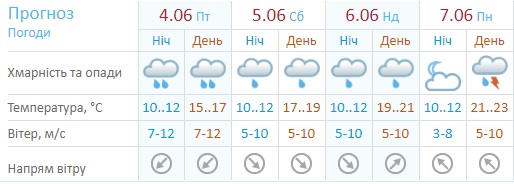 Вихідні також пройдуть з опадами, але вже слабкими. Проте потрохи потеплішає: у суботу, 5 червня, очікується +10...+12 °C вночі та +17…+19 °C вдень, а вдень у неділю передбачають звичні літні +19…+21 °C. Вітер при цьому залишатиметься свіжим із 5-10 м/с та повіє із північного заходу. Лише 6 червня він зміниться на південно-західний.