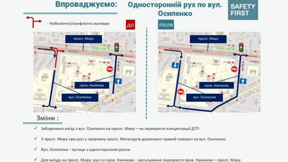 Василь Клат детально розповів, як здійснюватиметься дорожній рух на даній ділянці: «Тепер буде заборонений виїзд з вулиці Осипенка на проспект Миру. З проспекту Миру, при русі в напрямку по проспекту Металургів буде дозволений тільки правий поворот на вулицю Осипенка. Для виїзду на проспект Миру: рух по провулку Нахімова - це регульоване перехрестя провулка Нахімова з проспектом Миру».