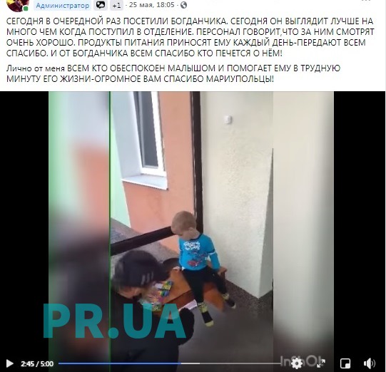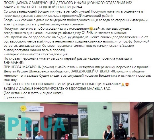 «Зі слів завідувачки, Богданчик почувається краще! Поступив хлопчик у відділення в шкарпетках, трусиках, виявили малюка перехожі (Іллічівський район). Богданчик втік з дому, не витримавши побоїв, принижень і голоду з боку «матері», а також всіх, хто приходять в цю неблагополучну «сім'ю». Поступив хлопчик в побоях, саднах і з виснаженням, зараз малюкові краще, з сьогоднішнього дня почав трохи посміхатися, йому ДУЖЕ не вистачає уваги. Є проблеми зі здоров'ям: на відео побачите на шийці синці (імовірно, від рук дорослої людини), обличчя в незрозумілих саднах, ранках, але що під футболочкою - залишається здогадуватися. Зі слів персоналу, синці тільки почали сходити (робимо висновок, що надійшов малюк увесь в побоях), «матір'ю» займаються служби, поліція!» - ділився результатами першої зустрічі маріуполець.