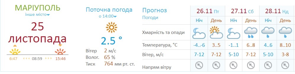 У неділю в Маріуполі видасться тепла ніч – адже напередодні Різдвяного посту, 28 листопада, за вікном буде +4...+6, а вдень і зовсім +10 градусів. Але протягом доби прогнозують слабкий дощ, південно-східний вітер вщухне до 3-8 м/с.