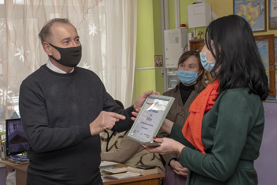 «Моя мета - підтримувати ініціативних, тому що саме вони мотивують інших займати активну життєву позицію. Ви задумали чудовий проєкт, щоб школярі могли читати улюблені книги, цікаво проводити час», - зазначив Сергій Магера та вручив директору грошовий сертифікат на придбання книг на 5 тис. грн.
