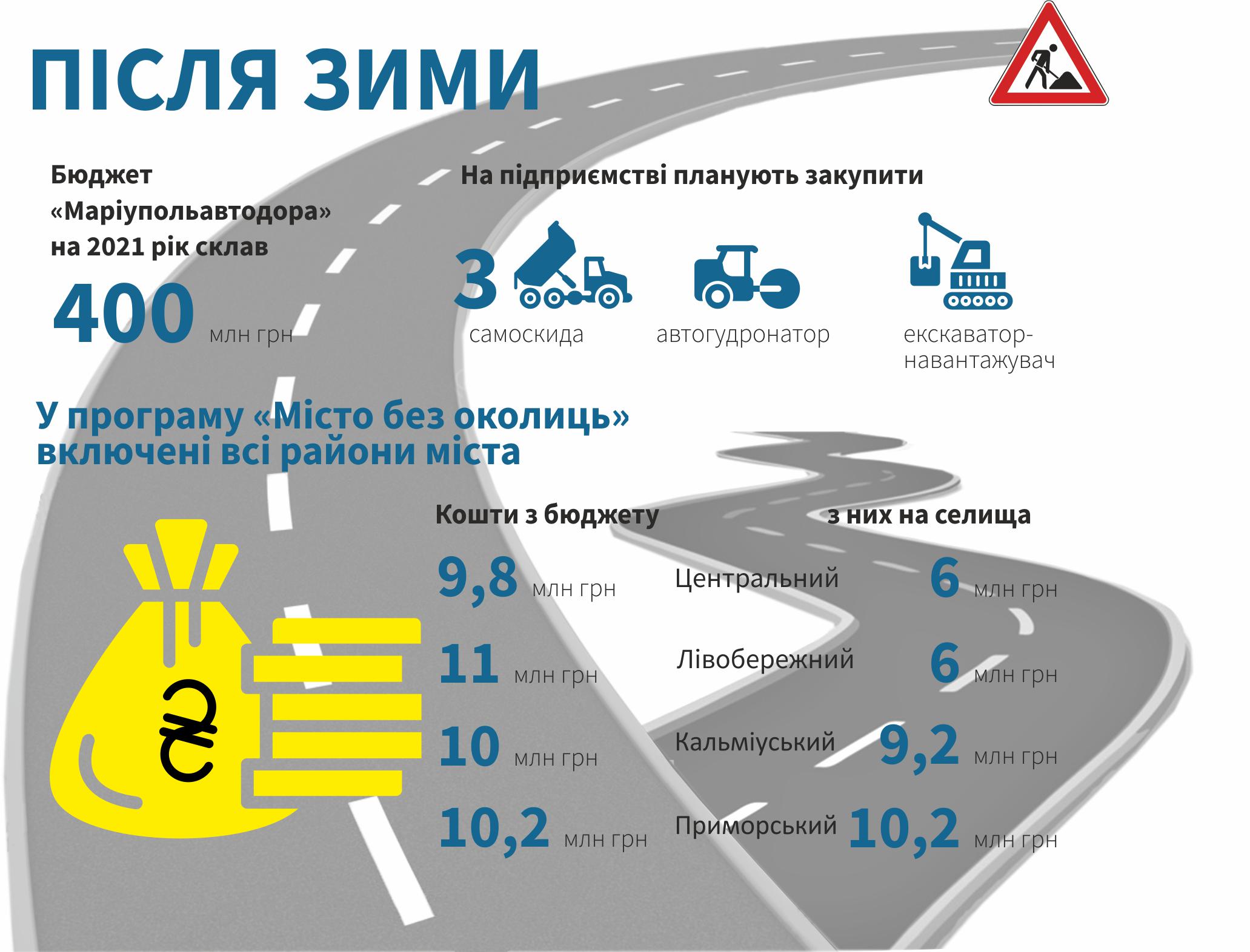 Незважаючи на те, що зима ще не закінчилася, працівники комунального підприємства «Маріупольавтодор», коли дозволяють погодні умови, ремонтують найбільш розбиті ділянки вулиць і проспектів. Що стосується доріг другого рівня - в міських селищах, то для їх відновлення в районних адміністраціях готують проектно-кошторисну документацію і починають пошук підрядних організацій. Ремонтувати планують «картами», тобто великими ділянками. На ці цілі за програмою «Місто без околиць» райони отримали в середньому по 10-11 млн грн, що майже вдвічі більше, ніж у минулому році.