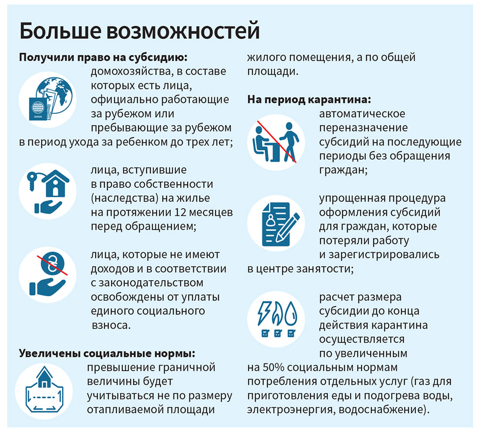 Тепер при встановленні права на отримання субсидії показник перевищення граничної величини буде враховуватися не за розміром опалювальної площі житлового приміщення, а за загальною площею. Ще з березня минулого року у зв'язку з карантином діє норма по автоматичному перепризначення субсидій на наступні періоди без звернення громадян. Крім цього, на період карантину введена спрощена процедура оформлення субсидій для громадян, які втратили роботу і зареєструвалися в центрі зайнятості. Розрахунок розміру субсидії до кінця дії карантину здійснюється за збільшеними на 50% соціальним нормам споживання окремих послуг (газ для приготування їжі та підігріву води, електроенергія, водопостачання).
